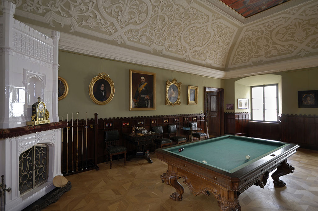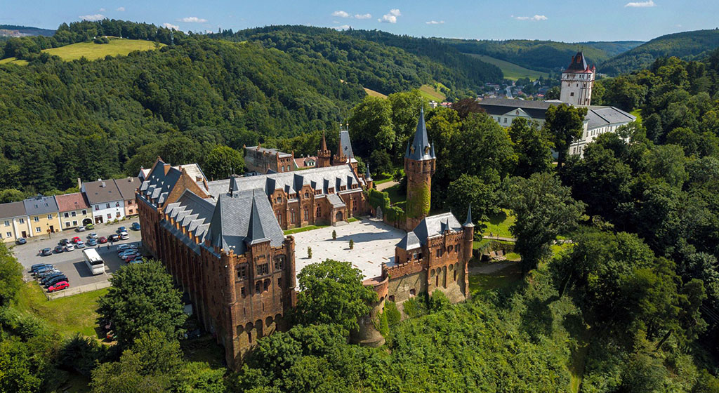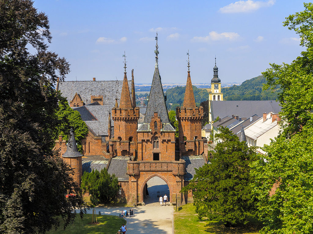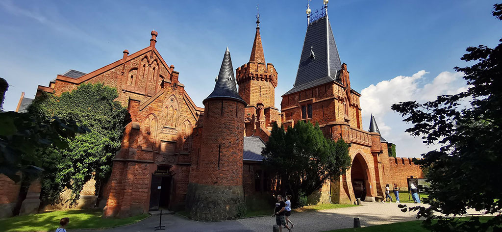 - Červený zámek: Novogotický klenot z červených cihel, který dnes slouží jako hotel a restaurace, ale jehož nádvoří a hradby jsou volně přístupné a tvoří nejfotografovanější část areálu. Byly zde původně umístěny luxusní konírny a kočárovny.